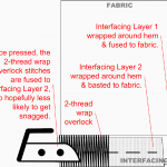 • First time I used 2-thread wrap overlock edge finishing. Again scary with no seam allowance. And the thread loops around the edge look so vulnerable to snags. Plus stretchy fabric means waist & hem risk stretching out of shape. So I tried to stabilize both waist & hem with Vilene Bias Tape fused so it wrap over the edge (1/2 on outside, 1/2 on inside). Then I did another layer, but this time basted it so that the adhesive is facing out. Next came the overlock. And finally pressing to fuse the overlock stitches to the 2nd layer of Vilene Bias Tape. Hopefully it’ll tame the loopy treads.