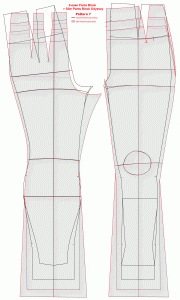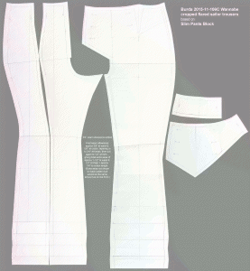 • Because the pants ended up hanging lower, I had to increase the height of the hem cuff to keep this capri length (just), and tweak the inseam & side seam to preserve the flare design (just). I ended up with 1-1/2″ extra ease at waist, tapering to nothing at knee, then widen back to same hem width as original design.