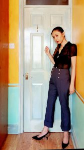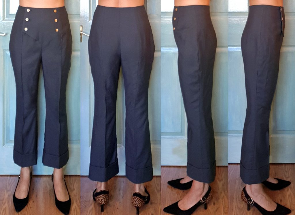• Design: High-rise, F centred dart, B centred dart > princess seam, capri length, flared below knees, cuffed, sailor pants front flap (buttoned along princess seams – instead of Burda version’s faux front with side zip), no pocket, hem cuff.