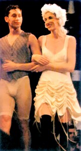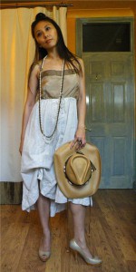 The funky A-line gore skirt has twill tapes inside on each gore seam which can be used to draw up the skirt into irregular bubble hem. It reminded me of this clipping of a Jean-Paul Gaultier dress from S/S ’91. So my initial design simply replaced the looser pull-on bodice with a corset style bodice.