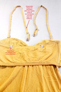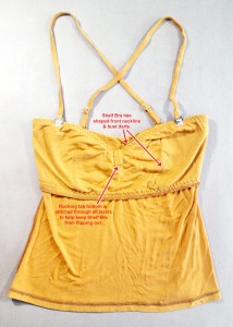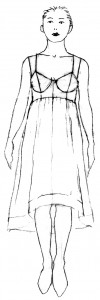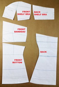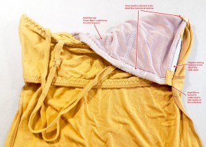 - Not shown: rectangular front closure modesty placket, bias binding for the hem, bias strips for the underwire channels.