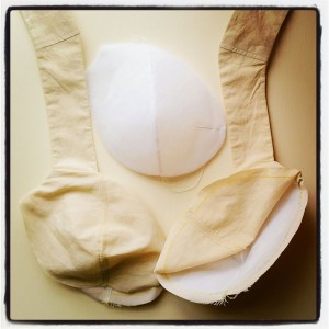 - I roughly followed the instruction in “Create a Foam-Cup Bra” article from Threads 9/2014 (issue 174). The cup padding pattern was drafted without seam allowance, then the pieces butt jointed with zig-zag stitches. The cup assemblage instruction was particular helpful to get a clean finish at neckline and armholes.