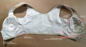 - Notions: Fiberfill padding fabric from Sew Sassy; underwires recycled from old CK bra; Rigilene boning; gold eyes & hooks from eBay.