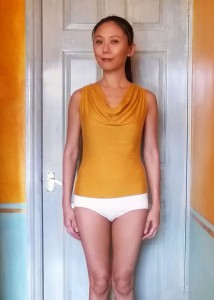 My cups weren’t particularly successful. Or at least they didn’t do what I wanted them to do. The Fiberfill is too thin for modesty padding. My cup shaping probably isn’t right either as it leaves me with deflated pointy apexes & still droopy old boobs. But the ease I did add in does allow me to wear a proper bra under this tight top. So problem averted this time.