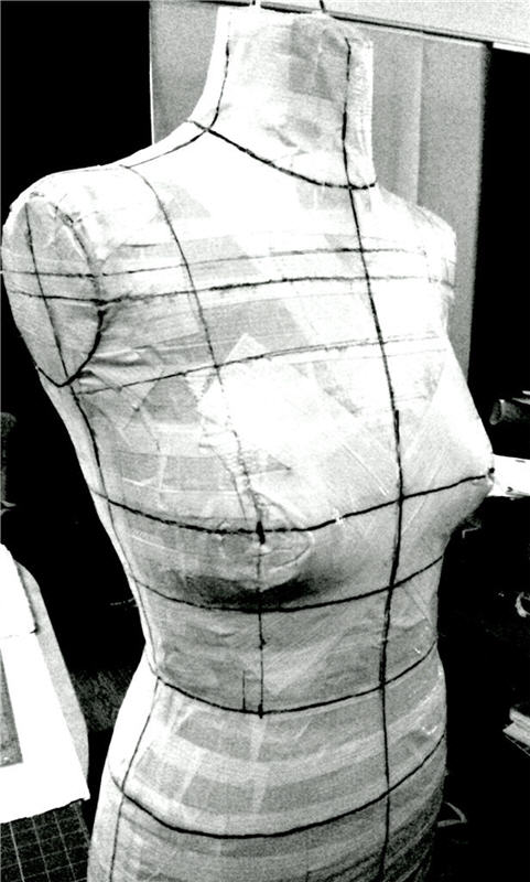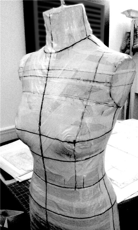 I tried drawing a few more guidelines to help me with the measurement. Problem is getting them level and straight. I tried using a DIY spirit level. But of course with all her curves it’s impossible to get a straight line going round her body. What looks straight from the front (the chest level lines) looked slanted from the side (higher at CF than at the side). Urgh.