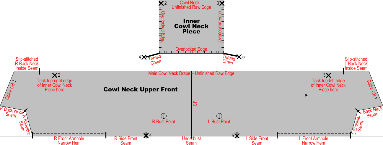 The front is one piece of fabric split into top cowl portion draped on the crosswise grain, and the bottom on the usual lengthwise grain. The back and side panels are from the second piece of fabric draped on the usual lengthwise grain.