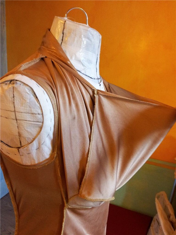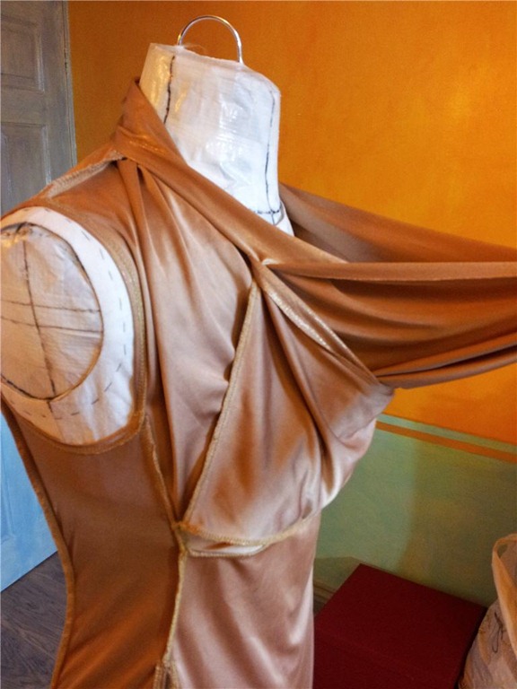 Originally I was going to use McCall 6078 sleeveless cowl neck T-shirt pattern again. But as my fabric pieces are reclaimed, they weren’t wide enough for the front pattern piece. So, necessity being the mother of invention, I played around with draping the fabric on Big Bertha. I was sure there was enough fabric. I just need to figure out how the fabric need to be positioned.