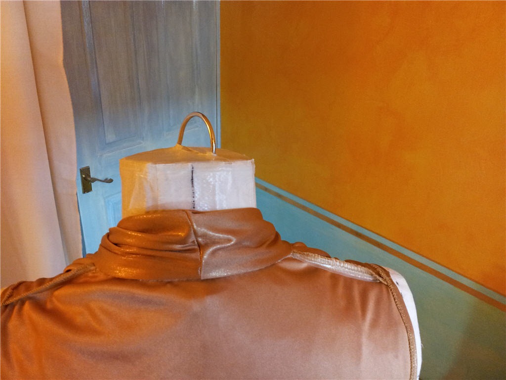 My cowl was a fair bit low cut. To preserve my modesty and also add more drape – can you ever have enough? – I added a separate rectangular piece inside the main cowl. The top two corners are tacked to the cowl neck edge about two inches below the shoulder seam (neck edge)…