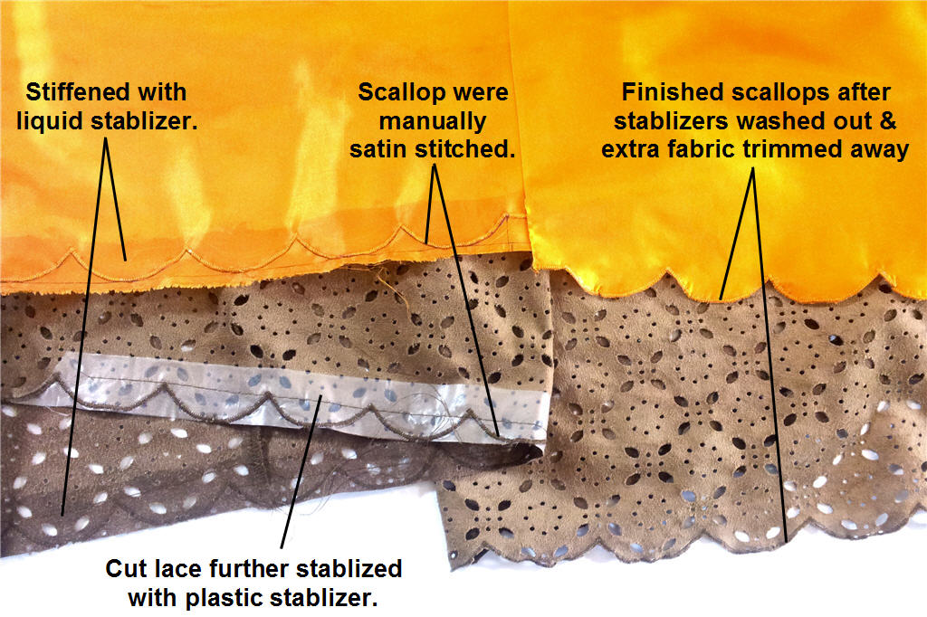 The fabric doesn’t come with scallop salvage. But I wanted scallops. The lacy pattern screams out for scallops. So scallops I will have. And of course the underlining being free-floating it must have its own scallops too. And of course the fancy scallop stitch that came with the sewing machine was not good enough: It was too narrow even if the length was adjustable to match the cut lace’s pattern repeat.
