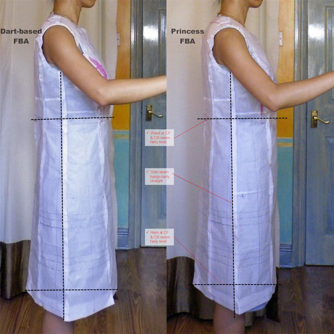 The dart-based FBA maybe has slightly better shaping at the bust. But that’s only because the princess seam on this pattern doesn’t run through the bust point. I could maybe shift the princess seam a bit towards the front / bust point to improve the shaping in the princess FBA version.