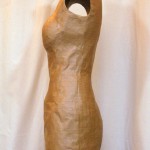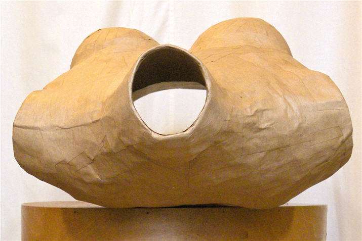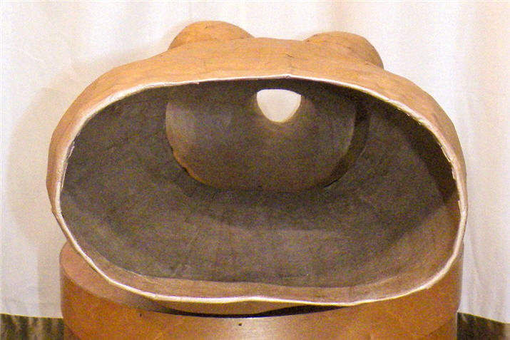 • 2b-5 The 11-layers total of tapes gave me a relatively stable form that’s about 1/8″ thick. It’s probably not as firm as 1/8″ of solid papier mache since it’s impossible to compact the paper tapes 100% and squeeze out all the air bubbles. But I think it’s firm enough to hold it’s shape without stuffing. So I’m going to leave her hollow and just do what needs to be done inside to ensure her PVC spine that’s going to go over the stand is straight & perpendicular to the floor.