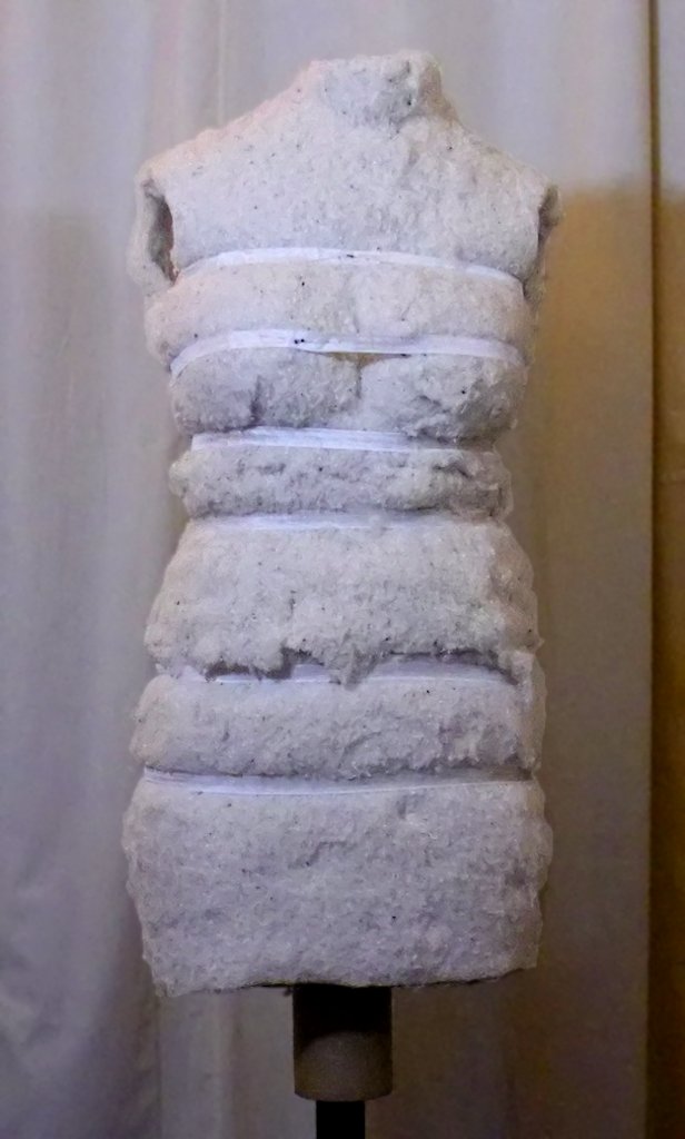Again, I hammered pins in to create the underbust and cleavage shaping. The bottom, like the interfacing layer, is folded over the hem edge and in this case stapled to Q’s cardboard bottom using a staple gun leftover from my collage days. (The interfacing was just fused to the cardboard.) … And where have the rolls gone?