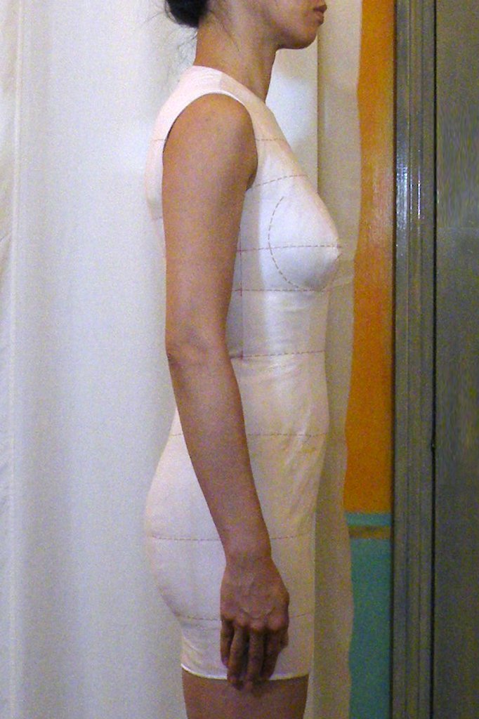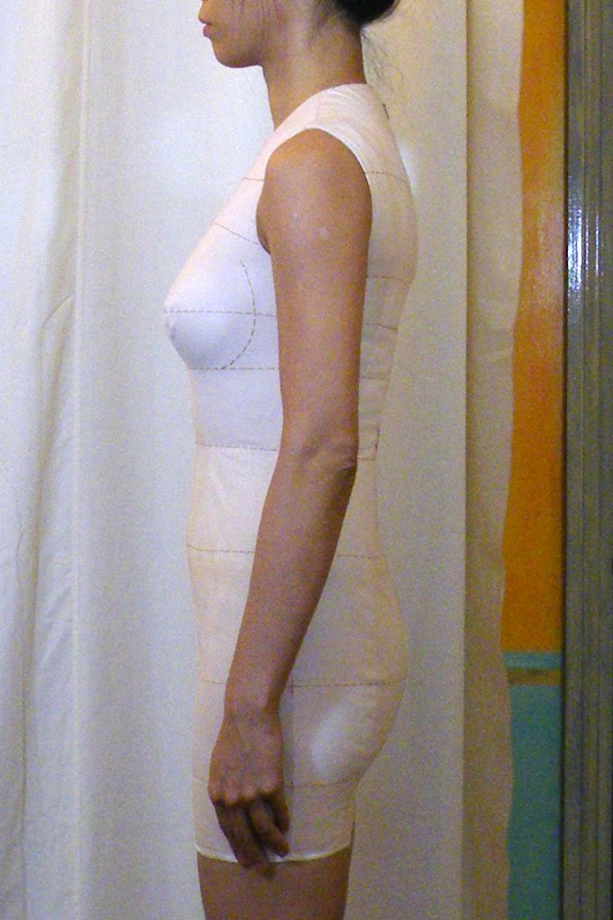 So with moulage pattern checked, I cut and pinned together the thin non-woven interfacing version. I then put this on Q with CF closure and checked the amount of padding again. Most of it was fine. It was a tight fit, but with a bit of careful tug and occasional spot fusing with a dry iron, I was able to rein in the fluff and get the interfacing moulage on.