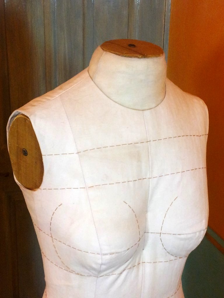 The ticking I got from John Lewis’ home decor fabric department is relatively thick – probably mid to heavy-weight. It covers any stubborn left-over rolls. You could probably use drill or canvas as well. I stained mine with cheap tea to give it an antiqued look. And although I added a CF bust fish-eye dart, I still hammered yet more pins for a more defined cleavage. The key circumferences are thread traced with top-stitching threads to guide future draping projects.