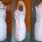1. First I used style tape (1/4″ black twill tape) on her to figure out the neck edges, hem, and internal seam / style lines I want.