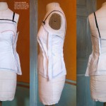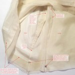• Gap-ahoy becomes puckering-ahoy. I really needed that muslin! As I said above, I might not have pivoted enough from CF bust to the french dart. (There actually was a small wedge left. But Q said it was tight enough already.) I only discovered this once the two layers were sewn together at the top edge. My only option was to undo & add another dart from the front armhole, OR add clear elastic to the top edge SA. Both are ugly. One’s a lot less work. Which do you think I went for? Next time I swear.