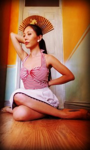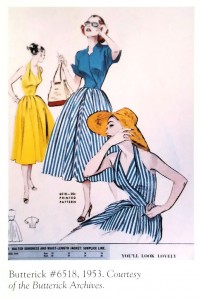 The stripy top isn’t available as a Burda pattern, and it looks like it’s a bustier top rather than a knit ruched bust top. But I thought the silhouette would be close enough. And I’m in no mood for drafting anything new & complicated. Being paranoid about tuby top over exposure, I decided to add halter straps as well. This was partly inspired by 1953’s Butterick 6518 which is featured in Blueprints of Fashion: Home Sewing Patterns of the 1950s. (I plan to one day make something like that too!)