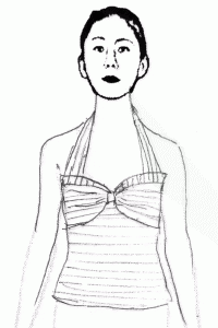 - Added halter straps: rectangles 2″ folded x length required to tie around neck CB, cut on crossgrain. This is positioned from front princess line outward towards the side seam.