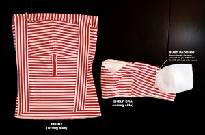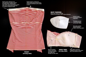 - Removable bust padding: Each pad is two layers. Princess seam in each padding layer is sewn separately using butted zig-zag stitches. The two layers for each pad are then overlocked together at the outer edges.