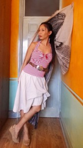 There wasn’t enough left for a normal T, even a sleeveless one. But there was just about enough for a strapless one, like the Bandeau Ruched Bust Top I just finished recently. My inspiration actually was an outfit from Burda 2013-13. (I already made a similar lace skirt. So now the stripy top. And yes, I’m plotting to eventually make the minty cardi as well!)