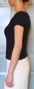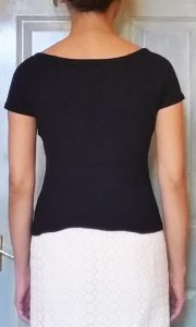 This is a straight replacement for a couple of RTW Ts that I wore to death. The pattern is essentially my Camden Town Kids Wannabe top minus the puff over-sleeves & the funky hem. I also tighten up a bit at the side seams since the cotton (+lycra?) knit I used for this version moulds to the body better, so can take on a body-con shape without draglines – unlike the totally artificial fibre fabric I used for the previous top.