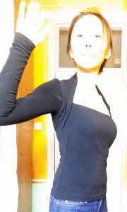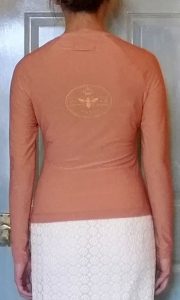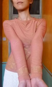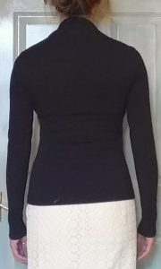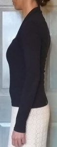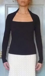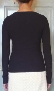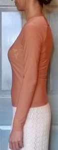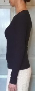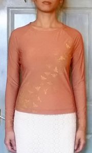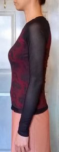 This time I tried adding length to both the raglan bodice & sleeve about mid-way up the armscye. This does seem to work better comfort-wise. But as the fabric I’ve used for this one – thin cotton jersey & lightweight power mesh – are both quite stretchy anyway, I won’t call this tweak a success just yet.