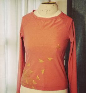 To jazz this up I again turned to gold stamping/painting Queen B on the back, swarm of worker bees on the front, & barcodes at the wrists. Unfortunately my initial attempt resulted in a poorly positioned worker bee on the front bodice. For a moment I thought I’d just own it like a proper feminist should. But I chickened out & invited more bees to disguised the mistake. I don’t like the resulting mess of a print as much, but hopefully it’ll make the T more wearable.