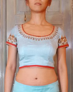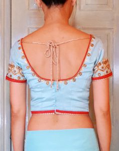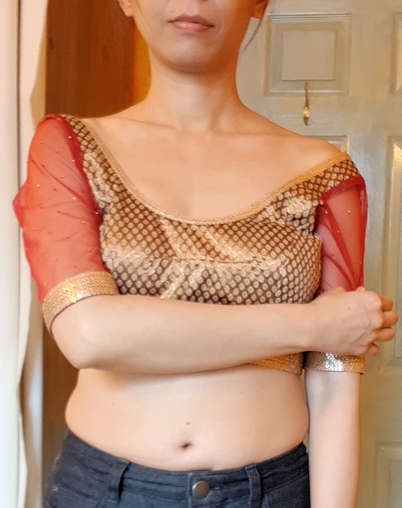 So there you have it (I think, for now anyway), if you want open neckline to stay on the shoulders, go with stretch Choli Blouse with 0 or even negative ease. If you insist on lovely pre-embroidered woven choli fabric with low open necklines, then stop being stubborn & keep that dori back neck-tie. That’s me told off then! 🙂