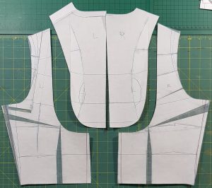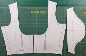 Now back to my choli pattern & drafting for arms up position, you can see in photos 3 & 4 how I tilted the shoulder seam by adding a wedge radiating from the princess seam / back waist dart to the side seams. This lengthen the side seams, make the shoulder more square and the neckline more U-shaped. The difference in side seam & shoulder seam lengths with arms up vs arms down was about 1.5″ for me. I ended up adding at the side seam about half that difference – because it seems like a sensible compromise & also it makes the necklines conform better to the pre-embroidered necklines. I positioned the pivot points of the tilt / wedge at the base of the necklines where they start angling up because I think this is where the tension will be and body movement will make the neck opening spread out, causing the sleeves to fall off the shoulder.