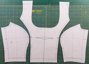 There is one YouTube video I found in English that offers a theory of what changes you need to make to lower the neckline. The narrower shoulder lines you see above is my attempt to apply that theory. But I was still too chicken to test on my pre-embroidered fabric.