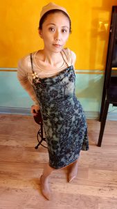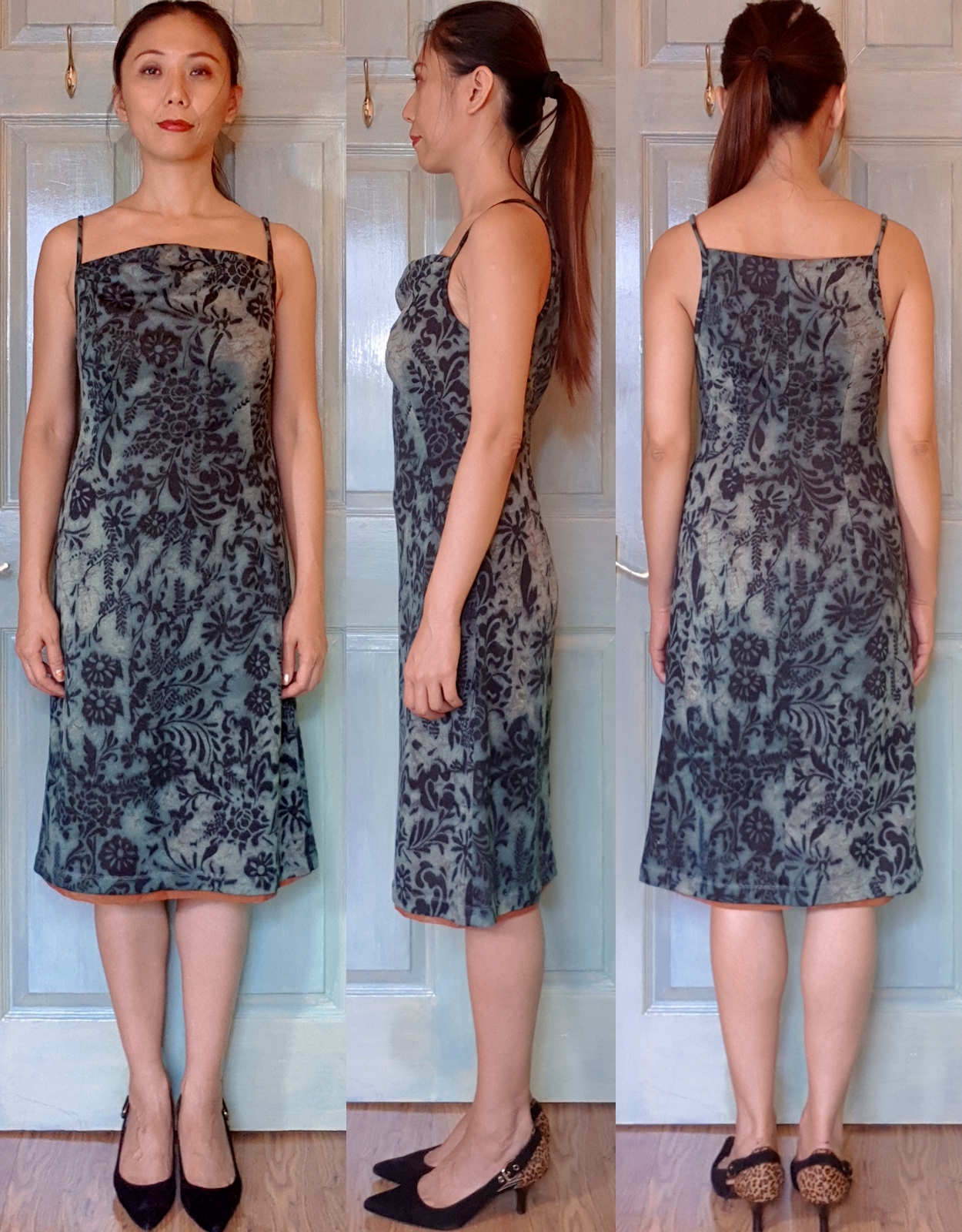 Because the fabric is slightly see through, I toyed with the idea of something like this Jean-Paul Gaultier 1990 Autumn/Winter dress ? extended vest ? But Ms Practicality vetoed the high side slits & I ended up with yet another variation of Burda 2012-04-128 dress…previously incarnated as a shimmering snake print dress & a defective yet still much worn camisole.