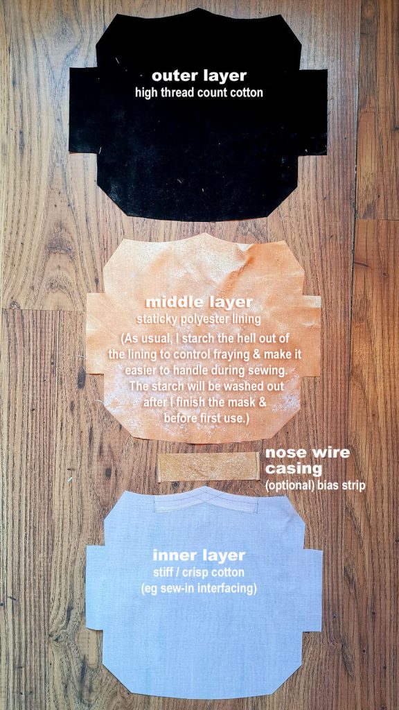 I initially thought that thin & soft fabrics would be most comfortable to wear. But I found they easily get sucked into my mouth when I talk & stick to my nose when I inhale. I think it is this clinginess that made breathing more difficult. So for my final mask, I went with crisp & stiff fabrics as much as possible, especially for the innermost layer. The most staticky fabric I found in my Stash was unfortunately quite drapy, but as long as the innermost material is stiff it helps keep the material away from my nostrils & mouth. And the pattern I ended up using also has pleats which allows you to stick a piece of paper to prop up the crucial nostril-mouth area if you can’t find suitably crisp fabric for the inner layer.