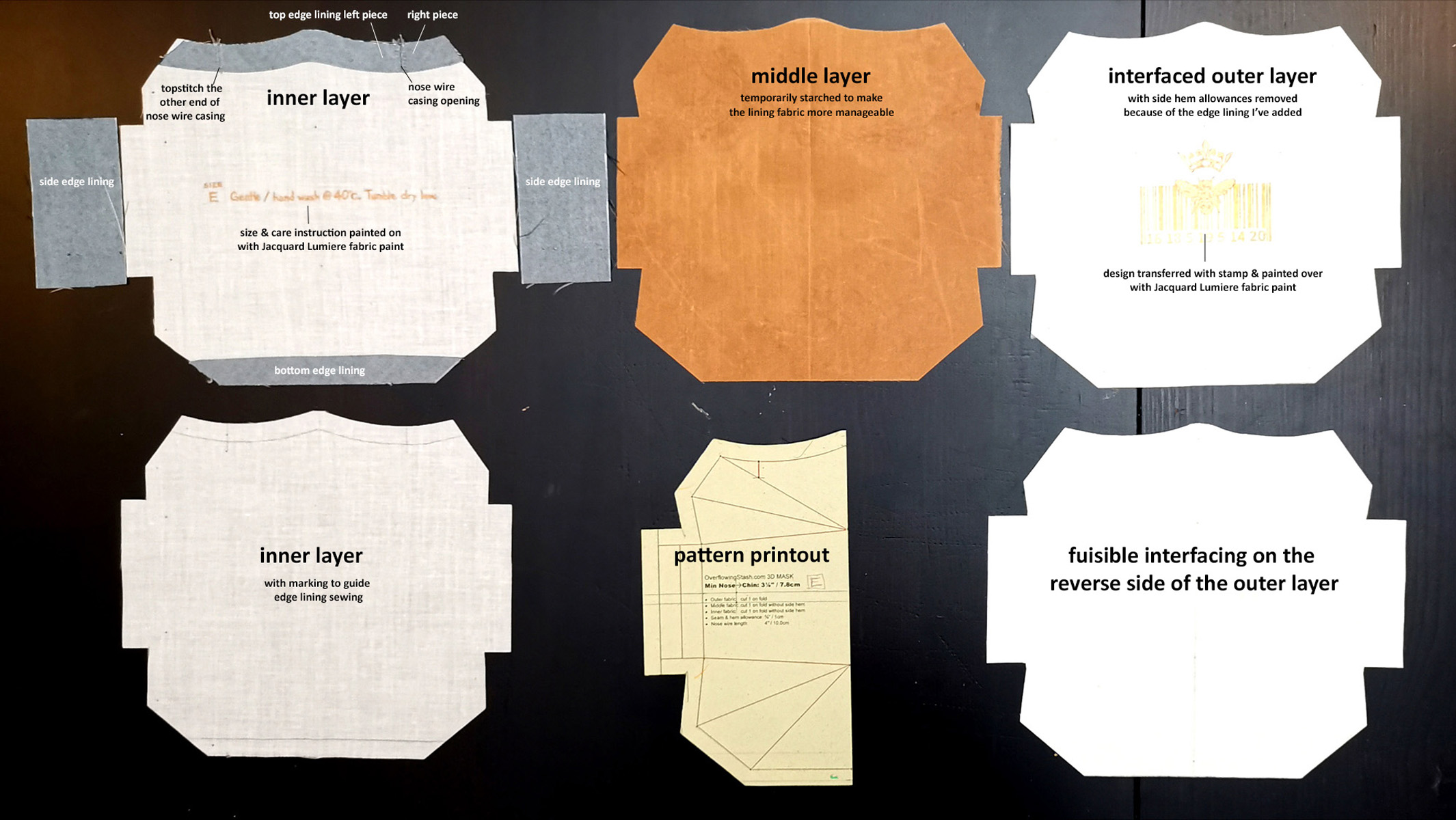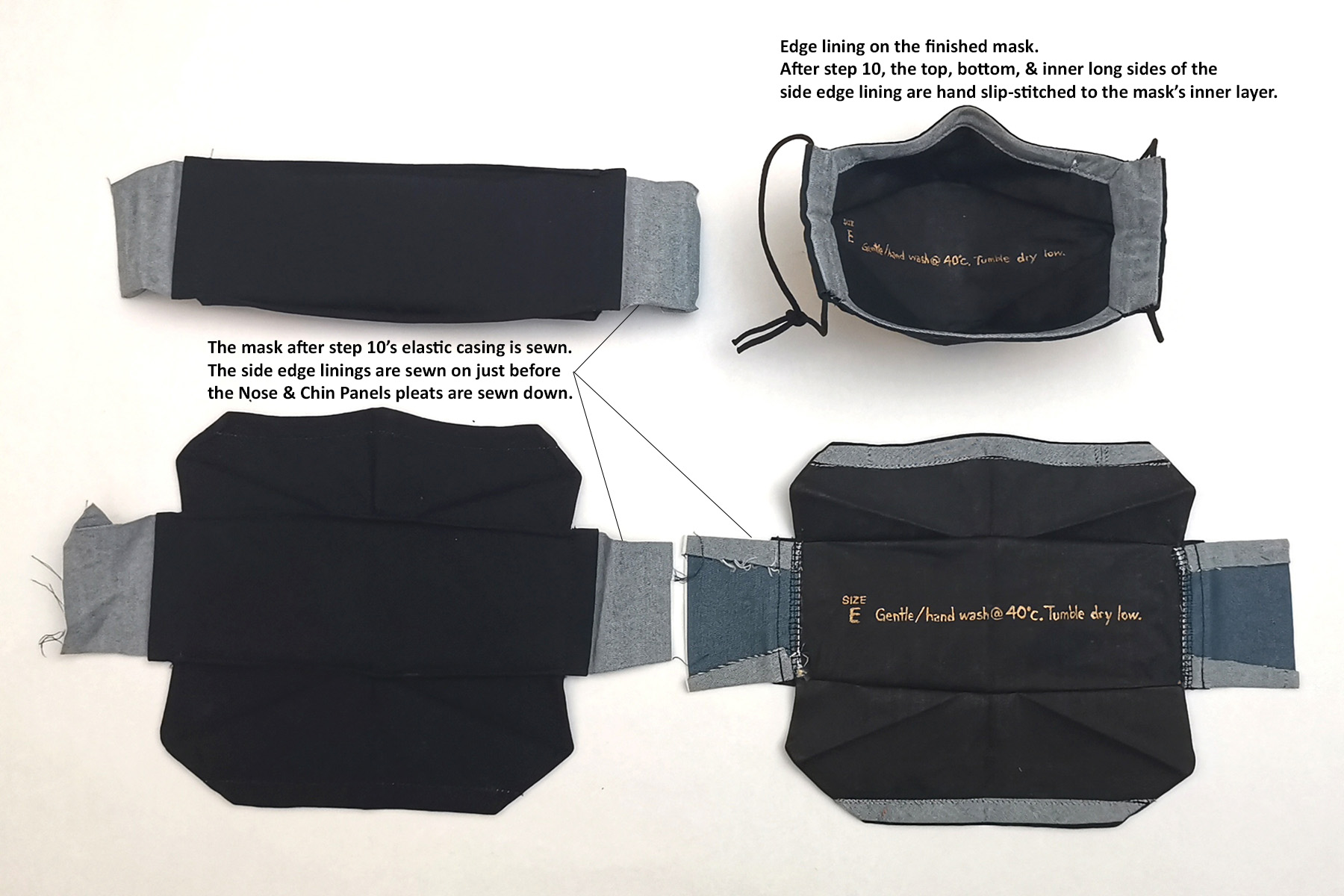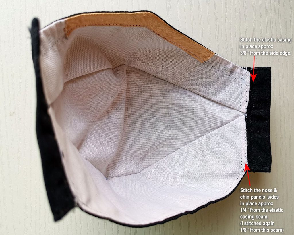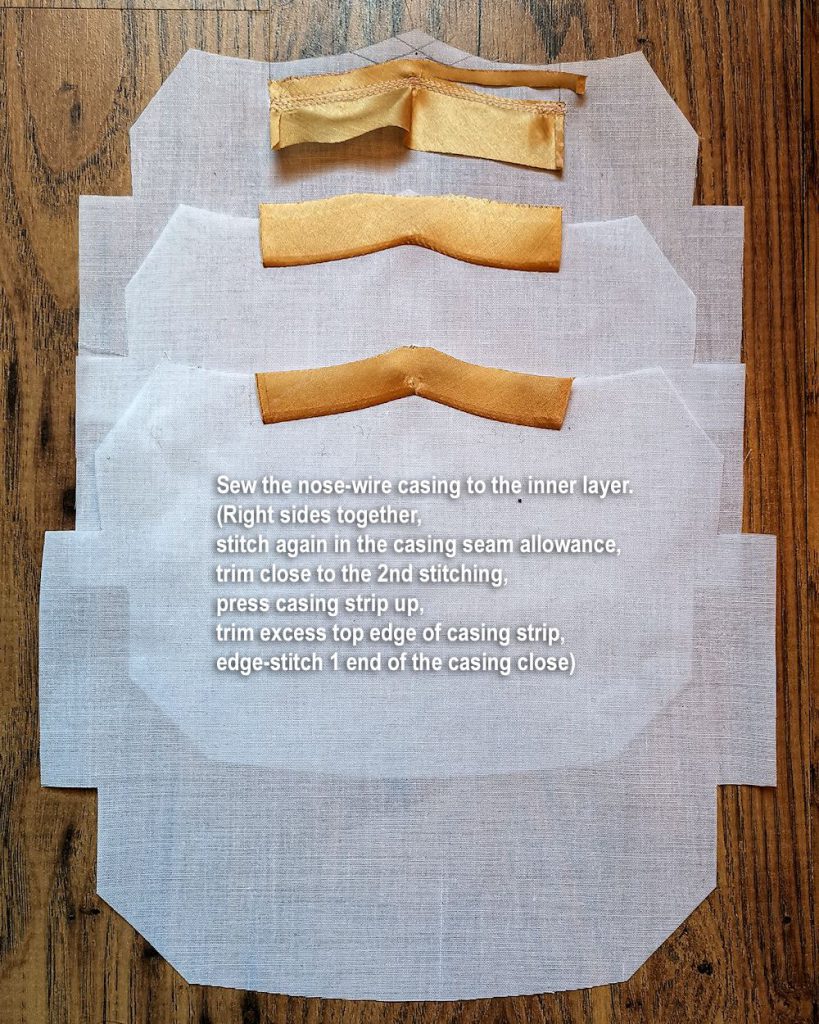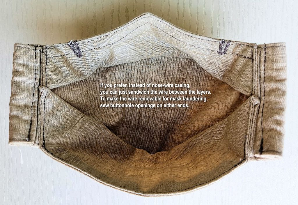 The sewing process is mostly the same as in my PDF instruction file. The main change I made is replacing the nose wire casing with edge lining the entire perimeter inside the mask. This is because my inner layer feels a bit rough on the skin. But it does add a nice finishing touch as well.