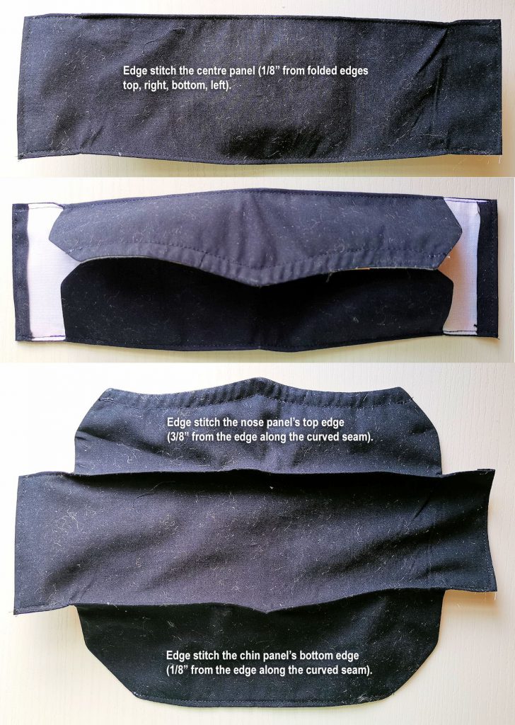 The last type I tried is the so-called “3D masks” patterns. There are numerous variations. Most have a centre edge top-stitched rectangle with pleated nose & chin panels: