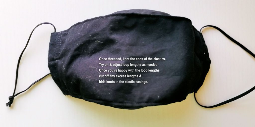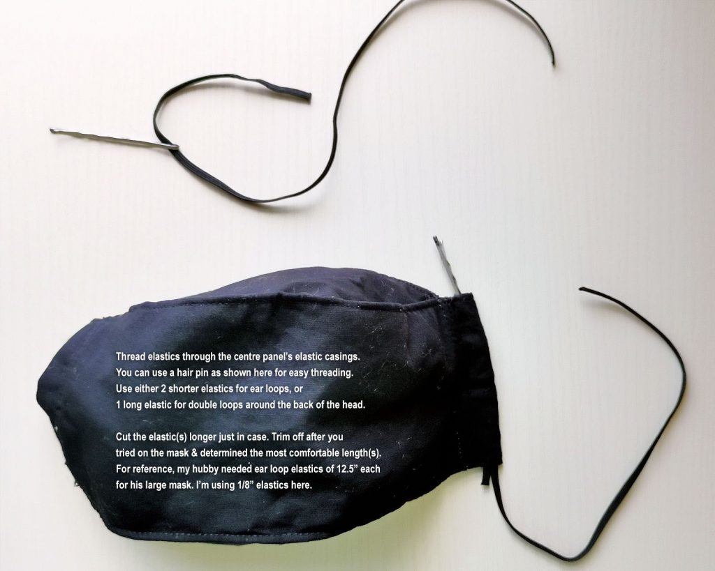 ear or head loops – 1/8″ elastic. In the end I chose to have it go around the back of my head even though it messes up my hair & is less convenient. I found ear loops always hurt the back of my ears after a while.