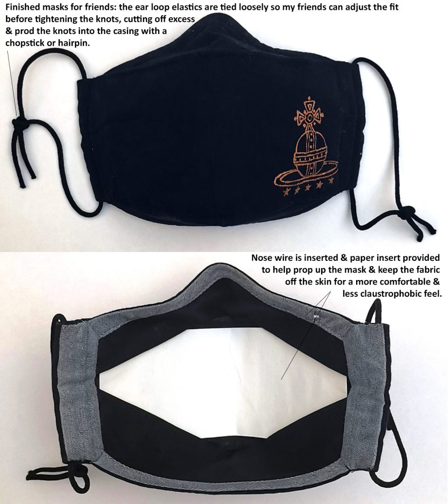 As friends of friends started asking if they could buy one, but I’ve ran out of supplies & time to make them, I’m sharing notes on my Friends & Family Only ‘couture’ version (??) in case anyone wants to pick up the banton & make them for their F&Fs or to sell. Hopefully more comfortable, better fitting, & more stylish masks will encourage people to wear them in higher risk situations. Stay safe everyone! Let’s don those masks so we can all get back to some semblance of normality sooner❣️