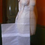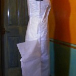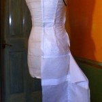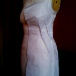 Designing by flat patterndrafting would be a nightmare. So again I turned to draping with Q. (The dress was originally draped on her mother Big Bertha.) I started out addressing what I didn’t like about the dress bodice: too much skin at the chest & side boobs…