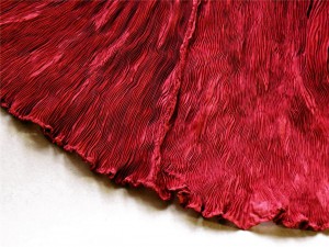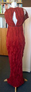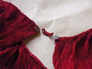 I was debating whether to finish the sleeve hems the same way, but decided to make it look more like the other upper edges – neck hem, back opening. This is to avoid distracting from the design line of the fluid flounce which flows into the fluid bottom hem. (There’s a bit of design thoughts going into this after all, even if the result isn’t quite as fashionable as I had hoped! }:-)