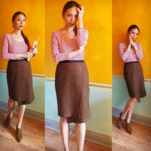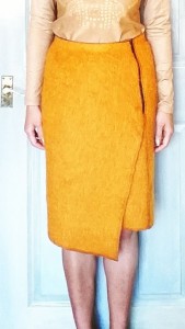 Pattern & construction: The wrap top was inspired by Romeo Gigli 1989 Spring/Summer collection. I had already attempted to recreate one before by adapting 90s Vogue Genny Designer Pattern 1390. But because I had limited amount of fabric to work with this time, I couldn’t reuse that pattern as is. Instead, I used the slide & pivot method to tweak that pattern for a more economical layout. I also changed the neckline border trim from shaped to straight for a stand-up collar look that’s more like Japanese kimono collar. The CB seam wasn’t necessary design-wise, but because I wanted to squeeze a skirt out of the scarf as well, this was the only way I could fit both garments into the yardage I had. Because the fabric is translucent, I went with french seams & manual blind hem.