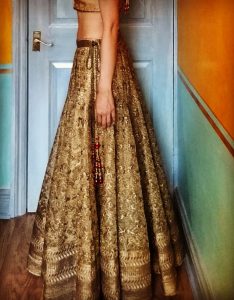 Fabrics: Jinaam Floral Tulip 7363 rayon Churidar trousers fabric, border from the Anarkali tunic’s skirt