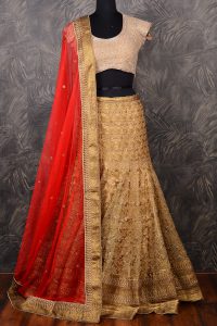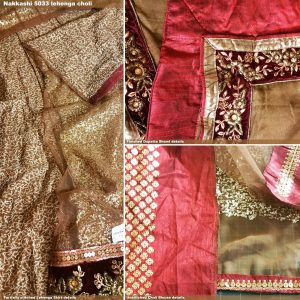The colour on this one is spot on. The panel skirt embellishment is on the top layer soft netting. So the threads in the back is protected by the orange lining / underlay. The shawl is chiffon with sewn on sequins. Both again have velvet trims with floral metallic embroidery. The stitching on this one is slightly twisted in places, but isn’t bad enough to show up in photos. So only perfectionist need to have these fixed! The blouse is dupion with sequin & metallic thread embroidery. Again, the marketing photos didn’t show the back. I scratched my head a bit when I first saw the shape of the embroidery, trying to figure out how it’s suppose to look. I think it’s meant to have a triangular cutout with neckline & below bust centre back closure. The cutout looks fairly large. So it’ll be hard to find a bra to wear with this if one needs proper bust support. Even the normal low-back bra extender won’t help as the top is cropped, so the extender looping at waist level will peep out.