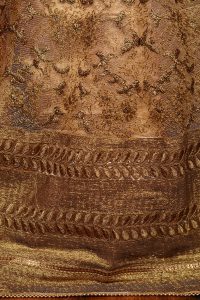 Unlike other tunics I’ve seen, this one is all sewn up except the sleeve seams. It’s obviously too big on me. Thankfully the bodice of the tunic is panelled. So I think all I have to do is to remove one panel per quadrant at the side seams. The sleeves are kimono shaped – ie no sleeve cap, so can be easily shortened at the armscyes. The bodice length is more troublesome. As the neckline is embellished & all finished, I guess I’ll have to do it at the hem. That means removing the borders, shortening the bodice, then reattaching the borders. While the fit at the moment is no where like on the model, I do kind of like the loose robe-like silhouette. I might keep that instead of making it more fitted like on the model.