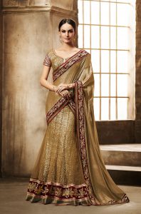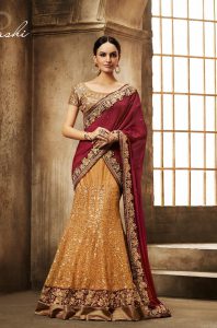 These “Half & Half Sarees” are skirt & shawl fabrics joined together to create a 2-colour saree. They’re worn like sarees & are different from “Half Sarees” which seems like another name for lehenga outfit with separate skirt & shawl.