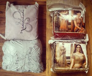 This time I tried the Salwar Kameez suits. These came as partly stitched tunic + fabric for trousers + RTW shawl. I’m still a bit confused about the names for the different types of suits, so pardon me if I called them by the wrong names. I think the ones I bought are called Anarkali Suits which have tunics that are fitted in the bodice & sleeves, & flared in the skirt. The trousers to go with these tunics seem to be the slimmer type called Churidar. I bought 3 brand name suits from Haya Creations in India. It’s the same place where I bought the two back-up lehenga choli outfits for my wedding which are still waiting to be sewn. Mea culpa.