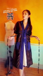 The result however looked a bit twee. Too safe. Which draws attention to the extra volume added by this fabric. I threw on some elastic to see where/how I can control this extra volume, but ended up liking the combination enough to use it in the final design. It’s just my cup of tea – the edgy contrast between utilitarian black elastic vs the fluid femininity of the mushroom pleat. Exposed elastic as a decorative detail is certainly not new to my aesthetic. My former favorite designer Comme des Garçons did it in Spring/Summer ’94. And I have a Jean-Paul Gaultier men’s robe with elastic waist ties from the 90’s that I wear a lot too.