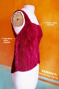 My cups weren’t particularly successful. Or at least they didn’t do what I wanted them to do. The Fiberfill is too thin for modesty padding. My cup shaping probably isn’t right either as it leaves me with deflated pointy apexes & still droopy old boobs. But the ease I did add in does allow me to wear a proper bra under this tight top. So problem averted this time.