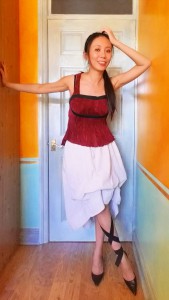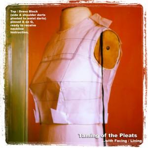 Designing by flat patterndrafting would be a nightmare. So again I turned to draping with Q. (The dress was originally draped on her mother Big Bertha.) I started out addressing what I didn’t like about the dress bodice: too much skin at the chest & side boobs…