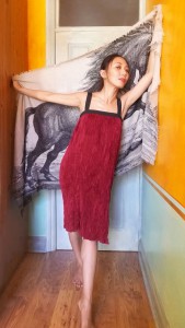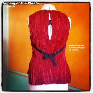 First off this fabric is a royal PITA to work with. Unlike Mario Fortuny’s Grecian Delphos which were made of silk, this is 70s Mary McFadden style polyester mushroom pleats. I don’t know if the Fortuny silk version drapes better, but my polyester version definitely balloons out in the most unflattering places, yet at the same time is highly shifty & unstable. An Utter Diva.
