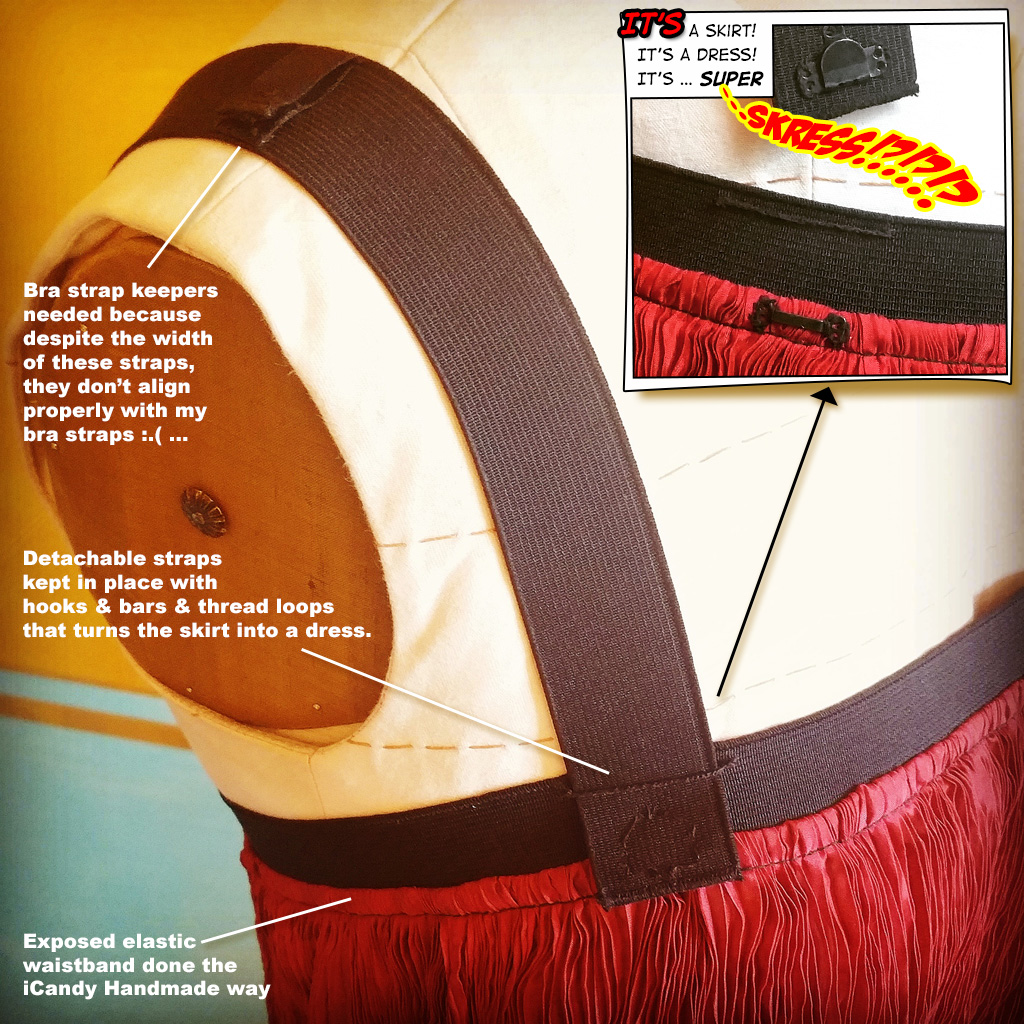 Matching detachable elastic shoulder straps & famine waist elastic belt complete the dress look. At a pinch the belt also yield a normal rise skirt. And if I sail to the edge I can also eke out a knee length skirt by doubling over the belt and leaving the built in waistband to hug my behind – not the most comfortable way to wear it, but hey we all have to make sacrifices for fashion right? 😉