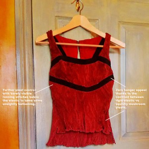 The top ended up with the most ridiculously complicated underpinning. See the annotated photos below for all the glorious gory details. That’s what you get with a Band-Aid approach to design! Definitely not a repeatable make. And as if that wasn’t enough, this thing has ZERO hanger appeal. This is definitely an Once Is Enough top.